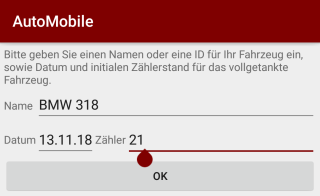Beim ersten Start des Programms sollten Sie einen Namen (z.B. Fahrzeugtyp oder Kennzeichen) sowie einen Anfangskilometerstand für Ihr Fahrzeug eingeben, der als Basis für alle zukünftigen Berechnungen verwendet. Dieser erste km-Stand sollte sich auf ein vollgetanktes Fahrzeug beziehen, damit die Verbrauchsberechnungen mit einem korrekten Wert beginnen.