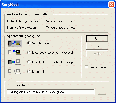 Es werden die normalen Synchronisierungsmethoden unterstützt (Synchronisieren, Handheld überschreibt Desktop, Desktop überschreibt Handheld). Sie können SongBook mit beliebig vielen PCs synchronisieren. Bitte beachten Sie, dass aus technischen Gründen Songs ignoriert werden, die sich auf einer Erweiterungskarte befinden.